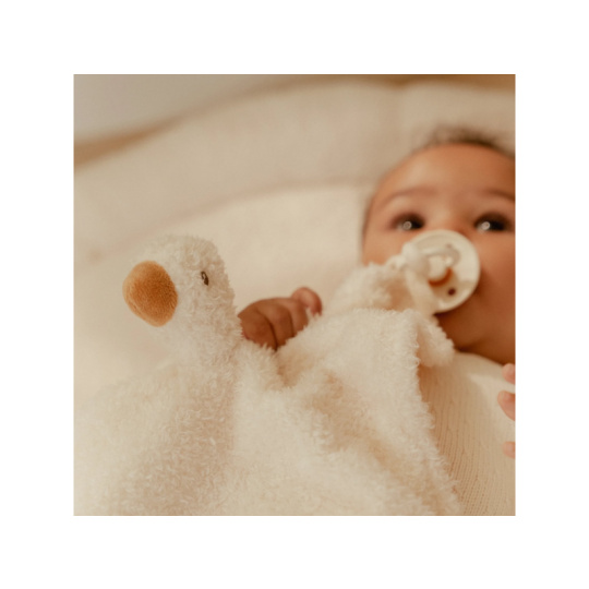 Plyšový muchláček s roztomilou husou a úchytem pro šidítko láká ke hraní i mazlení. Muchláček je je vyroben z velmi jemného a příjemného materiálu a je ideální jako společník do postýlky pro klidné usínání. Hračka je součástí designové kolekce hraček Little Dutch Newborn Naturals. Rozměry: 24 x 24 cm Složení: 100% polyester Výplň je vyrobena ze 100% recyklovaného polyesteru s certifikací GRS (Global Recycled Standard). Vhodné pro děti od narození.