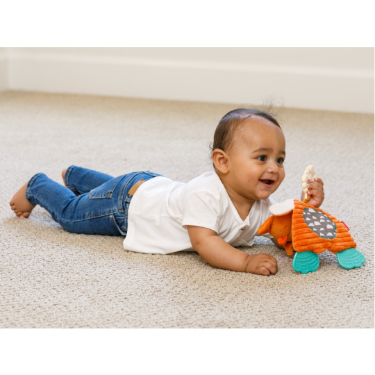 Mazlicí hračka s kousátky je vhodná jako první hračka dítěte. Různorodé textury i šusticí části lákají dítě ke zkoumání rukama i ústy. Kousátka dítěti uleví při prořezávání prvních zoubků. Vhodné pro děti od narození.