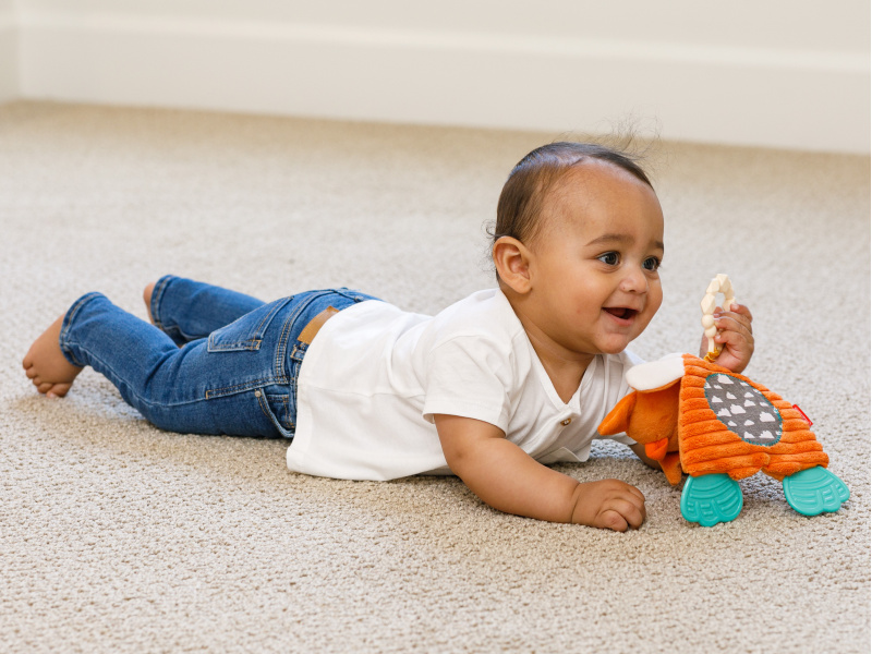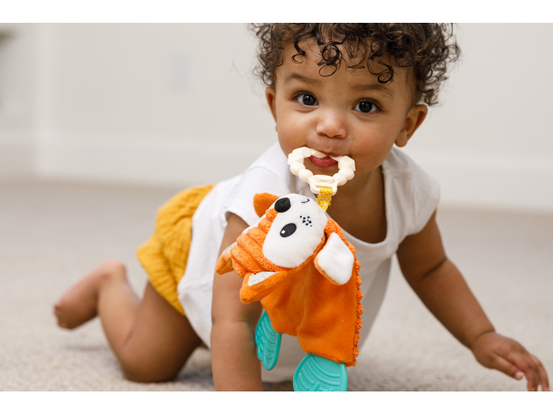 Mazlicí hračka s kousátky je vhodná jako první hračka dítěte. Různorodé textury i šusticí části lákají dítě ke zkoumání rukama i ústy. Kousátka dítěti uleví při prořezávání prvních zoubků. Vhodné pro děti od narození.