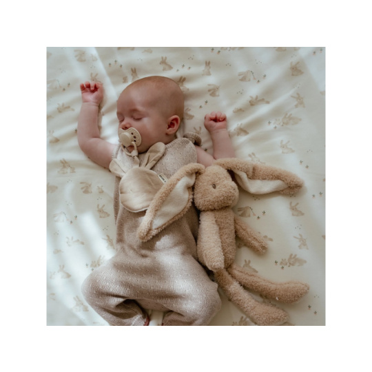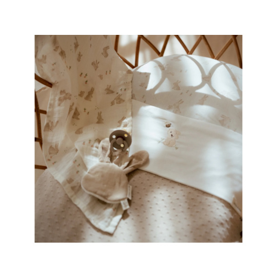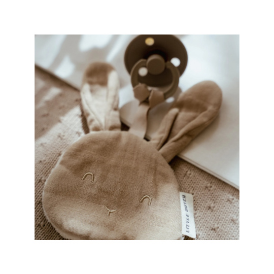 Měkoučký muchláček Little Dutch ve tvaru králíčka se rychle stane oblíbeným společníkem vašeho miminka. Je ideální na mazlení i jako praktický držák dudlíku, který dítěti poskytne pocit jistoty a pohodlí. Extra hebký materiál - přední strana z jemného mušelínu ze 100% organické bavlny, zadní z měkkého fleecu Bezpečné pro miminka - certifikace OEKO-TEX® Standard 100 zaručuje, že je látka šetrná k pokožce i zdraví miminka Praktické poutko umožňuje připevnit šidítko, aby se neztratilo ani neušpinilo Roztomilý design zajíčka s jemnými detaily v béžové barvě zapadne do každé výbavičky Ideální velikost pro malé dětské ručičky Složení: 100% organická bavlna, podšívka 100% polyester (fleece) Rozměry: 9 × 9,5 cm Možno prát v pračce.