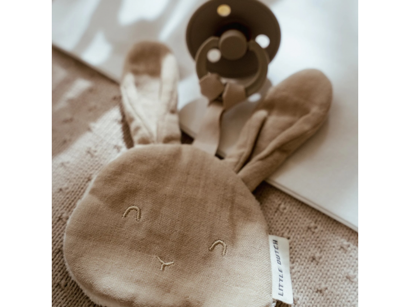 Měkoučký muchláček Little Dutch ve tvaru králíčka se rychle stane oblíbeným společníkem vašeho miminka. Je ideální na mazlení i jako praktický držák dudlíku, který dítěti poskytne pocit jistoty a pohodlí. Extra hebký materiál - přední strana z jemného mušelínu ze 100% organické bavlny, zadní z měkkého fleecu Bezpečné pro miminka - certifikace OEKO-TEX® Standard 100 zaručuje, že je látka šetrná k pokožce i zdraví miminka Praktické poutko umožňuje připevnit šidítko, aby se neztratilo ani neušpinilo Roztomilý design zajíčka s jemnými detaily v béžové barvě zapadne do každé výbavičky Ideální velikost pro malé dětské ručičky Složení: 100% organická bavlna, podšívka 100% polyester (fleece) Rozměry: 9 × 9,5 cm Možno prát v pračce.