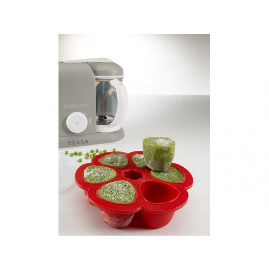 Zásobník na zeleninové i ovocné příkrmy do mrazáku. Jednotlivé porce nebo několik porcí najednou mohou být ohřívány ve vodní lázni nebo v mikrovlnné troubě. Silikonový měkký materiál je bezpečný a příjemný při používání. Je odolný vysokým i nízkým teplotám a není náchylný k vytváření skvrn od barevných potravin. Vhodné pro použití v mrazáku, mikrovlnné troubě i myčce na nádobí. Kapacita 900 ml (6× 150 ml).