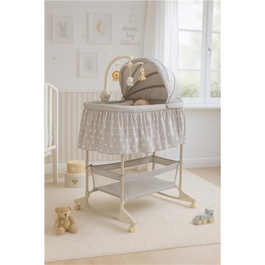 Multifunkční dětská kolébka New Baby je ideální volbou jak pro děti, tak pro rodiče, pro které je klíčová funkčnost a bezpečí. Výrobek slouží jako postýlka i kolébka. Její mobilita poskytuje obrovské pohodlí, protože dítě bude vždy v blízkosti svých rodičů. Praktický koš vám umožní mít vše potřebné na dosah ruky a včas reagovat na potřeby mrňouska, aniž byste se od něj museli vzdalovat. Potah kolébky je vyroben z prodyšného a příjemného na dotek materiálu, který lze snadno sundat a vyprat. Kolotoč s barevnými zvířátky je vybaven nočním světlem, hudebním modulem s 8 melodiemi a funkcí jemných vibrací s možností změny jejich intenzity. Je napájen 3 bateriemi AA LR6-1,5 V (nejsou součástí dodávky). Jednu ze stran postýlky lze rozepnout, což oceníte během každodenní a často i noční péči o Vaše děťátko.