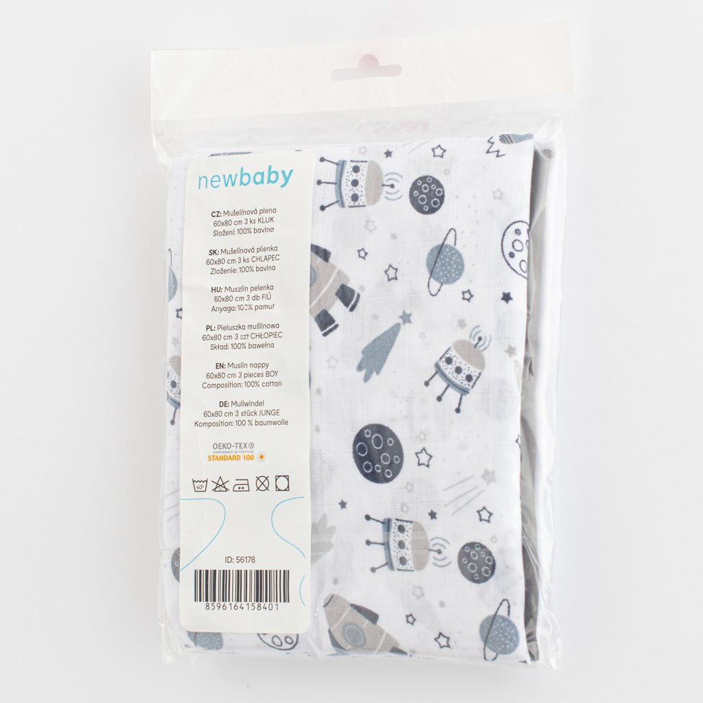 Mušelínové dětské pleny New Baby ve zvýhodněné sadě. Vysoce kvalitní plenky s výhodnou gramáží. Dobře absorbují vlhkost, umožňují dětské pokožce dýchat a nedráždí ji. Balení obsahuje 3 ks. Dvě plenky jednobarevné a jedna s obrázkem. Vhodně zvolené barvy a obrázky pro chlapečky. Lehká konstrukce umožňuje mušelínu „dýchat“ a zajišťuje dostatečnou cirkulaci vzduchu, čímž snižuje riziko přehřátí. Tato vlastnost pomáhá udržet vaše miminko v pohodlí, bezpečí a rodiče v klidu. Mušelín je velmi odolný, a to natolik, že snadno zvládne opakované praní a časem je lehčí a měkčí. Mušelínová plena je ideální na léto, kdy může nahradit přikrývku v postýlce nebo kočárku. Multifunkční výrobek, který se vyplatí mít ve své výbavě. Rozměr: 60x80 cm. Složení: 100% bavlna. Gramáž materiálu: 110g/m2. Certifikát: OEKO-TEX STANDARD 100.