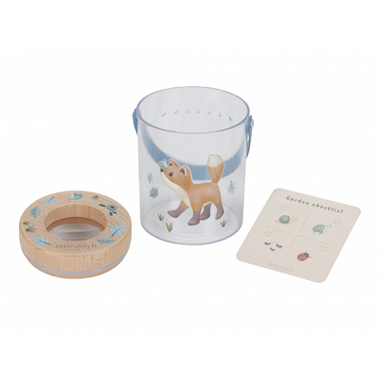 Nádoba na hmyz s krásným potiskem umožní vašemu dítěti bezpečným způsobem pozorovat hmyz, který žije na zahradě či v lese. Nádobka z průhledného plastu má dřevěné víčko s lupou pro zkoumání i těch nejmenších detailů. Větrací otvory zajišťují větrání v nádobce. Díky držadlu se nádobka snadno přenáší. Součástí nádobky je i kartička s obrázky různých malých živočichů, které jsou ideální pro pozorování. Nádoba s krásným potiskem je součástí designové kolekce hraček a doplňků Little Dutch Forest Friends, inspirované životem v lese. Rozměry: 8 x 7,6 x 10 cm Vhodné pro děti od 3 let.