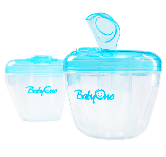 Praktický zásobník na sušené mléko, využitelný při cestování a vždy, když se s dítětem nacházíte mimo domov. Odstraňte všechny bezpečnostní prvky, které by mohly být nebezpečné pro dítě. Výrobek by měl být zkontrolován před každým použitím. Při prvních známkách poškození nebo opotřebení jej zlikvidujte. Vždy používejte pod dohledem dospělé osoby. Výrobek není hračka. Doporučujeme uchovat obal pro informaci. Obal uchovávejte na místě nepřístupném dětem. Před prvním použitím opláchněte výrobek horkou vodou (nevařte!) a osušte. Pokud výrobek myjete v myčce nádobí, vyjměte jej ihned po dokončení programu a osušte. Ponechání výrobku v myčce po umytí může způsobit deformace. Adresa dodavatele: Babyono sp. z o.o., Kowalewicka 13, 60-002 Poznań, Poland. +48 61 83 90 520, info@babyono.pl, www.babyono.com