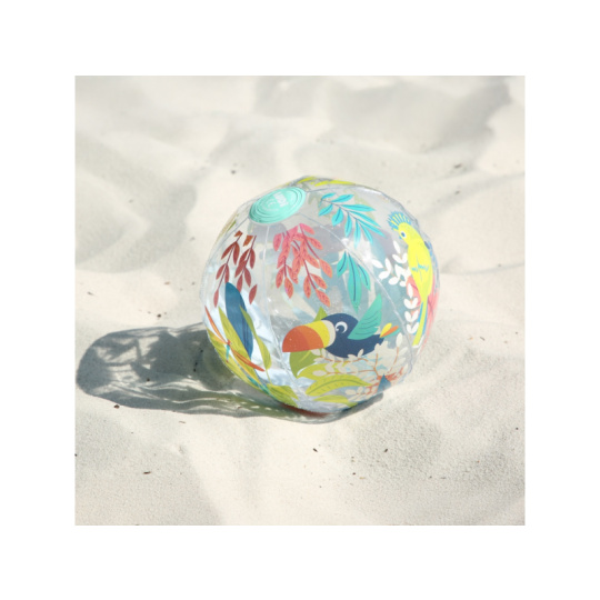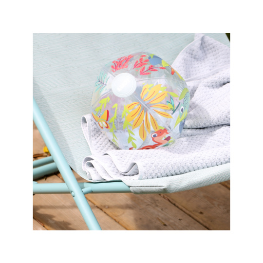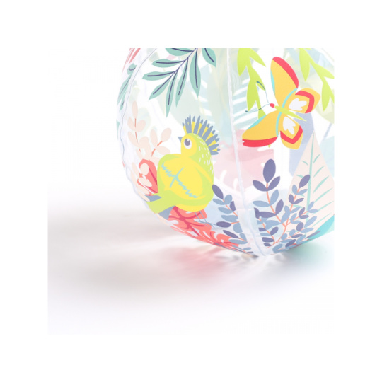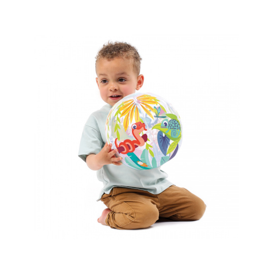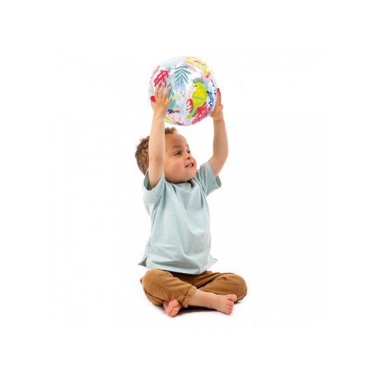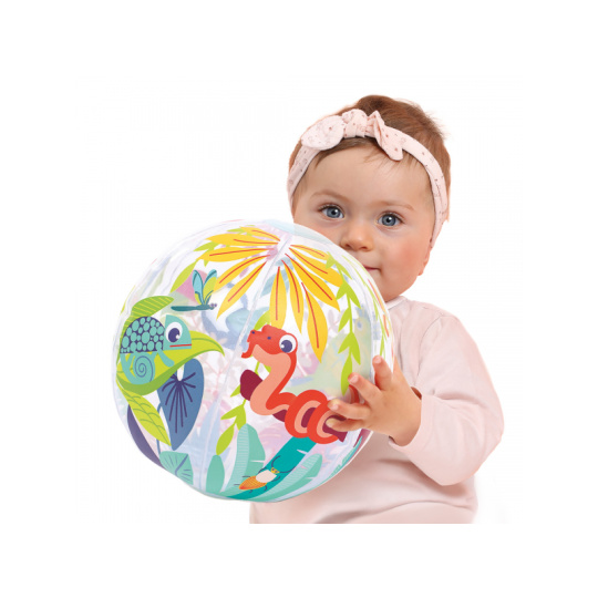 Nafukovací míč Jungle Ball je navržený speciálně pro nejmenší – pomáhá dětem objevovat svět pohybu, hmatu i zraku. Díky tropickému motivu a veselým barvám přitahuje pozornost a probouzí přirozenou zvídavost dítěte. Děti si s míčem mohou házet, kutálet ho, odrážet i sledovat jeho pohyb. Hraní s míčem stimuluje hrubou motoriku, reflexy i představivost. Míč má ideální průměr 20 cm – snadno ho uchopí i malé dětské ručky Měkce nafouknutý a příjemný na dotek – bezpečný při hře doma i venku Průhledné detaily přidávají vizuální zajímavost a podporují rozvoj zraku a koordinace Rozměry: Ø 20 cm Složení: 100 % PVC Vhodné pro děti od 6 měsíců.