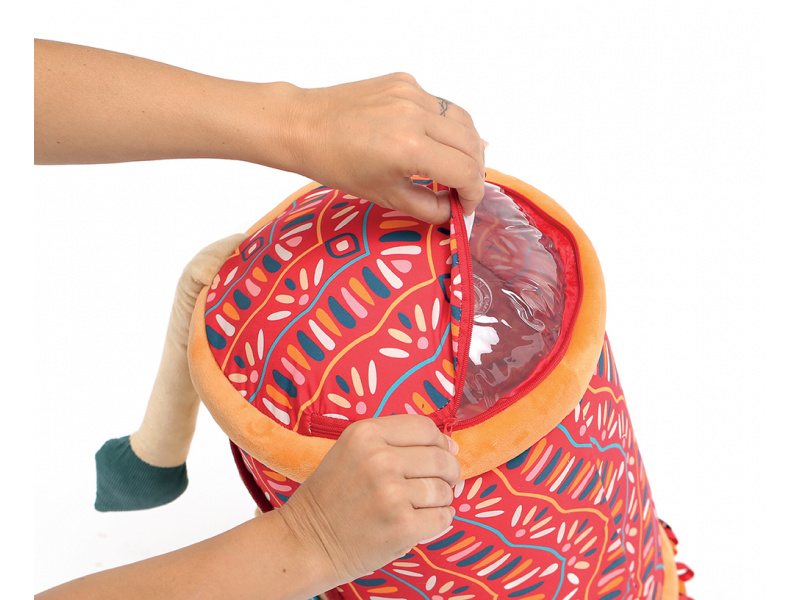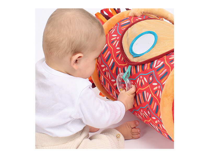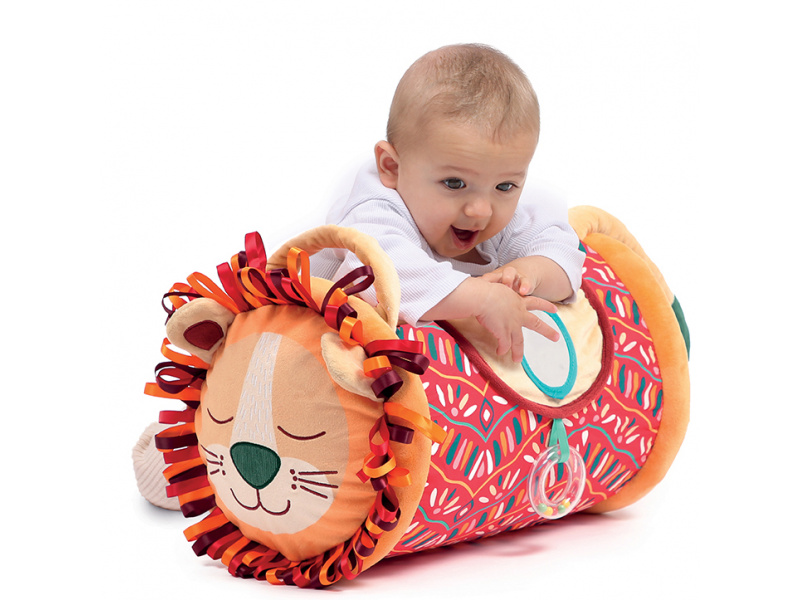 Originální hračka ve tvaru válce s množstvím aktivit pro zkoumání zabaví dítě a současně podněcuje rozvoj jeho smyslů a motorických dovedností. Uvnitř skrývá cinkající míčky, textilní potah nabízí různorodé textury, bezpečné zrcátko i chrastítko. Vnitřní část je nafukovací, takže válec je lehoučký a dítě ho dokáže snadno zvednout. Snímatelný textilní potah je možné prát v pračce. Rozměry: 45 x 27 x 27 cm Vhodné pro děti od 6 měsíců.