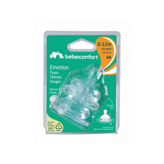 Silikonová savička Bebeconfort Emotion svým tvarem a vlastnostmi připomíná mateřský prs. Dítě tak téměř nepociťuje rozdíl mezi kojením a krmením z lahvičky. Dvojitý ventilační systém na okraji savičky citlivě zabezpečí únik vzduchu z láhve, tím umožní plynulé sání tekutiny a zároveň snižuje riziko břišní koliky. Savička s variabilním průtokem je určena pro děti od narození do 12 měsíců. Pootočením lahvičky můžete zvolit rychlost průtoku mléka od pomalé po střední úroveň. Neobsahuje bisfenol A.