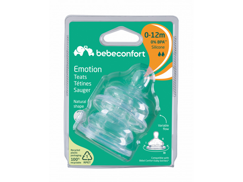 Silikonová savička Bebeconfort Emotion svým tvarem a vlastnostmi připomíná mateřský prs. Dítě tak téměř nepociťuje rozdíl mezi kojením a krmením z lahvičky. Dvojitý ventilační systém na okraji savičky citlivě zabezpečí únik vzduchu z láhve, tím umožní plynulé sání tekutiny a zároveň snižuje riziko břišní koliky. Savička s variabilním průtokem je určena pro děti od narození do 12 měsíců. Pootočením lahvičky můžete zvolit rychlost průtoku mléka od pomalé po střední úroveň. Neobsahuje bisfenol A.
