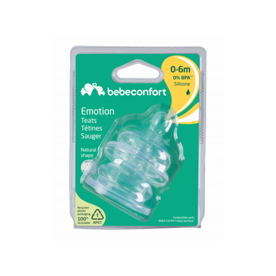 Silikonová savička Bebeconfort Emotion svým tvarem a vlastnostmi připomíná mateřský prs. Dítě tak téměř nepociťuje rozdíl mezi kojením a krmením z lahvičky. Dvojitý ventilační systém na okraji savičky citlivě zabezpečí únik vzduchu z láhve, tím umožní plynulé sání tekutiny a zároveň snižuje riziko břišní koliky. Savička s pomalým průtokem je určena pro děti od narození do cca 6 měsíců. Neobsahuje bisfenol A.