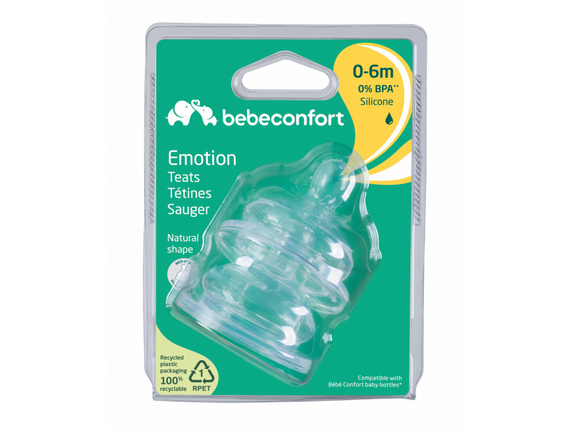 Silikonová savička Bebeconfort Emotion svým tvarem a vlastnostmi připomíná mateřský prs. Dítě tak téměř nepociťuje rozdíl mezi kojením a krmením z lahvičky. Dvojitý ventilační systém na okraji savičky citlivě zabezpečí únik vzduchu z láhve, tím umožní plynulé sání tekutiny a zároveň snižuje riziko břišní koliky. Savička s pomalým průtokem je určena pro děti od narození do cca 6 měsíců. Neobsahuje bisfenol A.