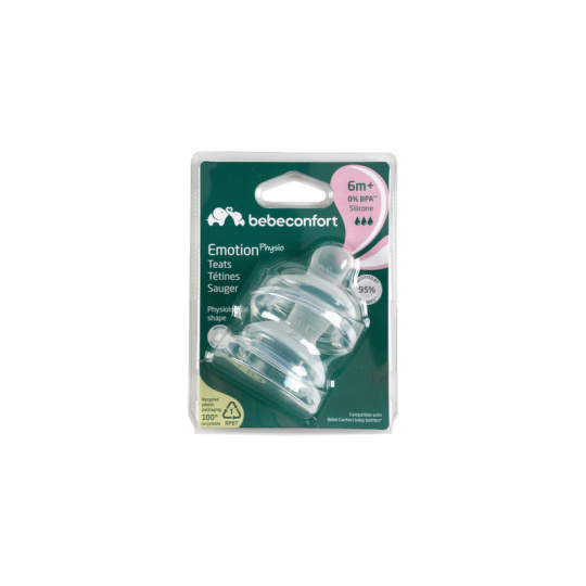 Silikonová savička fyziologického tvaru Bebeconfort Emotion Physio je zárukou, že dítě téměř nepociťuje rozdíl mezi kojením a krmením z lahvičky. Dvojitý ventilační systém na okraji savičky citlivě zabezpečí únik vzduchu z láhve, tím umožní plynulé sání tekutiny a zároveň snižuje riziko břišní koliky. Savička s rychlým průtokem je určena pro děti od 6 měsíců. Určeno pro použití s kojeneckými lahvemi Bebeconfort Emotion Physio. Neobsahuje bisfenol A.