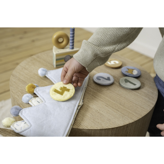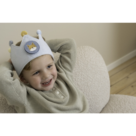 Krásná textilní korunka pro malého oslavence či oslavenkyni ozvláštní originálním způsobem narozeninový den vašeho dítěte. Korunka nabízí výměnná čísla 1-5 a je tak ideální pro použití od prvních do pátých narozenin. Neutrální kolečko s obrázkem zvířátka pak můžete na korunku umístit kdykoli při hraní na princeznu či krále. Zapínání na suchý zip umožňuje přizpůsobit korunku velikosti hlavy dítěte. Rozměry: 13 x 55,5 x 1,5 cm Vhodné pro děti od 12 měsíců.