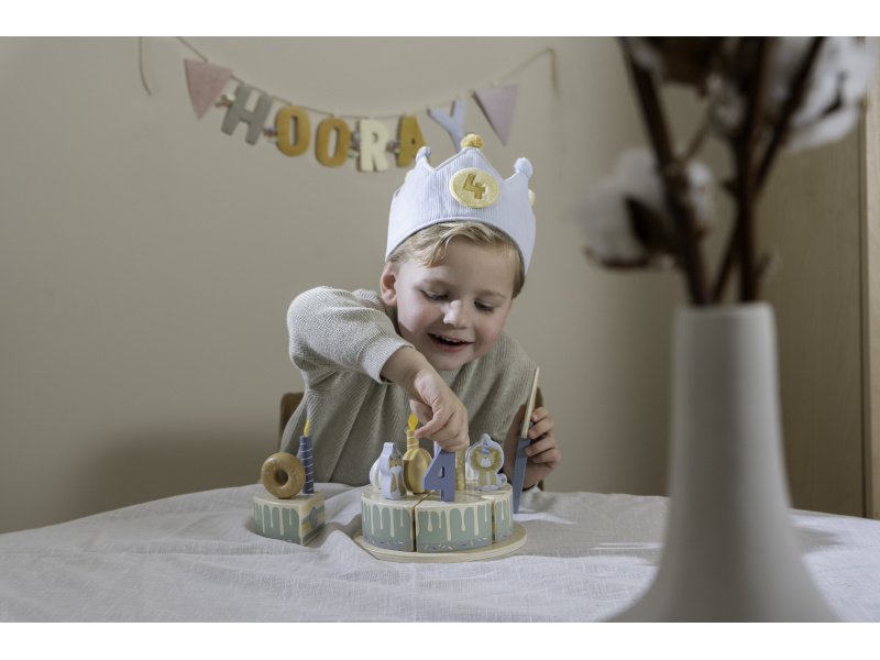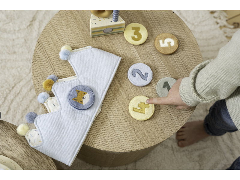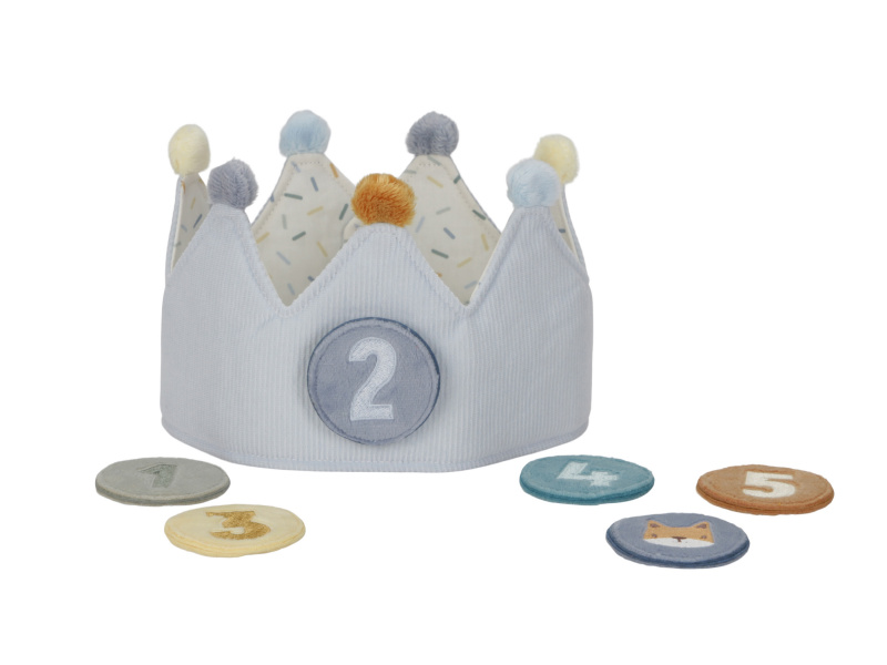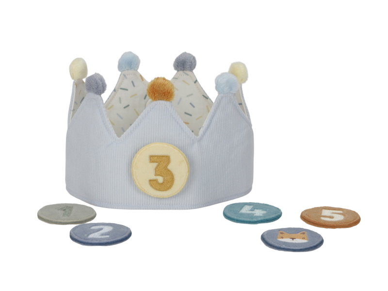 Krásná textilní korunka pro malého oslavence či oslavenkyni ozvláštní originálním způsobem narozeninový den vašeho dítěte. Korunka nabízí výměnná čísla 1-5 a je tak ideální pro použití od prvních do pátých narozenin. Neutrální kolečko s obrázkem zvířátka pak můžete na korunku umístit kdykoli při hraní na princeznu či krále. Zapínání na suchý zip umožňuje přizpůsobit korunku velikosti hlavy dítěte. Rozměry: 13 x 55,5 x 1,5 cm Vhodné pro děti od 12 měsíců.