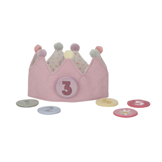 Krásná textilní korunka pro malého oslavence či oslavenkyni ozvláštní originálním způsobem narozeninový den vašeho dítěte. Korunka nabízí výměnná čísla 1-5 a je tak ideální pro použití od prvních do pátých narozenin. Neutrální kolečko s obrázkem květiny pak můžete na korunku umístit kdykoli při hraní na princeznu či krále. Zapínání na suchý zip umožňuje přizpůsobit korunku velikosti hlavy dítěte. Rozměry: 13 x 55,5 x 1,5 cm Vhodné pro děti od 12 měsíců.