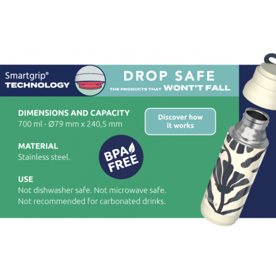 Termoska Quokka Pulse z vysoce kvalitní dvoustěnné oceli se spolehlivým, 100% těsnicím uzávěrem udrží váš nápoj dle potřeby teplý či studený. Široké hrdlo umožňuje vložení kostek ledu. Termoska udrží teplotu studeného nápoje s ledem až 48 hodin, studeného nápoje až 16 hodin a teplého nápoje až 12 hodin. Silikonové poutko, které je zakomponované do víčka láhve, usnadňuje přenášení. Quokka Pulse je součástí kolekce lahví a hrnků Drop Safe se speciálním dnem Smartgrip®, které při postavení na hladký povrch brání převržení a nechtěnému vylití obsahu láhve. Tvar láhve je vhodný do většiny držáků nápojů v autě. Objem: 700 ml Rozměry: 240 x 79 mm Nerezový materiál neabsorbuje pachy a neobsahuje BPA. Termoska není vhodná do myčky ani mikrovlnné trouby.