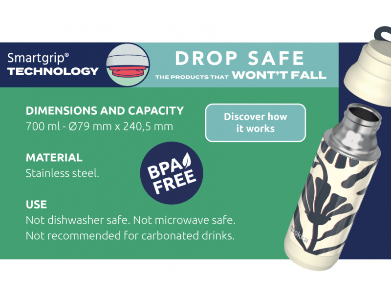 Termoska Quokka Pulse z vysoce kvalitní dvoustěnné oceli se spolehlivým, 100% těsnicím uzávěrem udrží váš nápoj dle potřeby teplý či studený. Široké hrdlo umožňuje vložení kostek ledu. Termoska udrží teplotu studeného nápoje s ledem až 48 hodin, studeného nápoje až 16 hodin a teplého nápoje až 12 hodin. Silikonové poutko, které je zakomponované do víčka láhve, usnadňuje přenášení. Quokka Pulse je součástí kolekce lahví a hrnků Drop Safe se speciálním dnem Smartgrip®, které při postavení na hladký povrch brání převržení a nechtěnému vylití obsahu láhve. Tvar láhve je vhodný do většiny držáků nápojů v autě. Objem: 700 ml Rozměry: 240 x 79 mm Nerezový materiál neabsorbuje pachy a neobsahuje BPA. Termoska není vhodná do myčky ani mikrovlnné trouby.