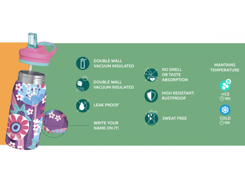 Dětská termoláhev Quokka Pop Kids z vysoce kvalitní dvoustěnné oceli udrží nápoj i během horkých letních dní příjemně studený. Láhev s pítkem a brčkem umožňuje snadné pití bez nutnosti naklánění láhve. Zaklapávací pítko brání vylití obsahu láhve. Široké hrdlo umožňuje vložení kostek ledu a zároveň se díky němu láhev snadno čistí. Údržbu usnadňuje i odnímatelné široké brčko. Díky držadlu se láhev snadno přenáší. Termoláhev udrží teplotu studeného nápoje až 10 hodin, při vložení kostek ledu až 18 hodin. Na spodní části láhve je prostor pro napsání jména nebo nakreslení obrázku, aby nedošlo k záměně ve školce či ve škole. Objem: 445 ml Rozměry: 184 x 72 mm Nerezový materiál neabsorbuje pachy a neobsahuje BPA. Termoláhev není vhodná do myčky ani mikrovlnné trouby.