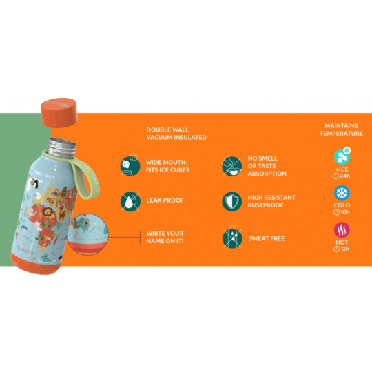 Dětská termoska Quokka Solid Kids z vysoce kvalitní dvoustěnné oceli se spolehlivým, 100% těsnicím uzávěrem udrží nápoj dle potřeby teplý či studený. Široké hrdlo umožňuje vložení kostek ledu. Termoska udrží teplotu studeného nápoje s ledem až 24 hodin, studeného nápoje až 10 hodin a teplého nápoje až 12 hodin. Termoláhev je vybavena poutkem pro snadné přenášení. Na spodní části láhve je prostor pro napsání jména nebo nakreslení obrázku, aby nedošlo k záměně ve školce či ve škole. Objem: 330 ml Rozměry: 177 x 68,5 mm Nerezový materiál neabsorbuje pachy a neobsahuje BPA. Termoska není vhodná do myčky ani mikrovlnné trouby.