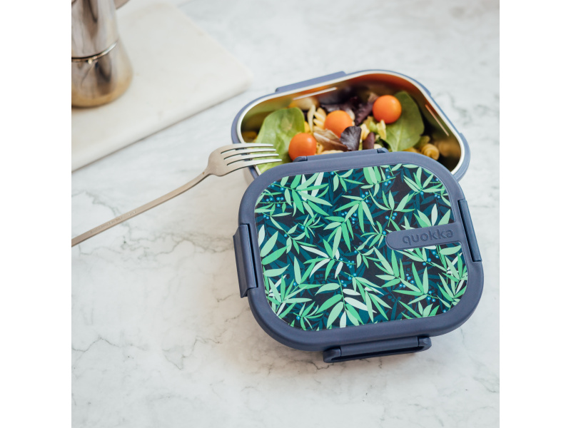 Box na jídlo Quokka Kai z vysoce kvalitní nerezové oceli s plastovým víkem je vhodný pro bezpečné přenášení svačiny či oběda do školy, do práce i na výlety. Spolehlivé, 100% těsnicí víko s klipovým zapínáním chrání obsah boxu před vylitím či vysypáním. Nerezový materiál neabsorbuje pachy a je tak vhodný pro jakékoli jídlo. Objem: 1 l Rozměry: 180 x 165 x 68,5  mm Složení: nerezová ocel, PP Neobsahuje BPA. Box není vhodný do myčky ani mikrovlnné trouby.