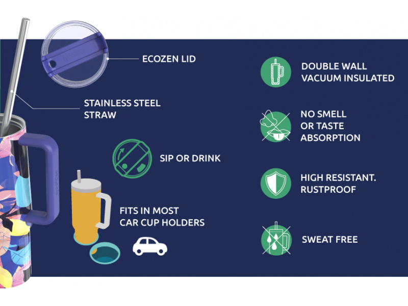Termohrnek Quokka Vibe z vysoce kvalitní dvoustěnné oceli udrží teplotu nápoje studeného s ledem až 48 hodin, studeného až 14 hodin a teplého až 8 hodin. Termohrnek s vyjímatelným nerezovým brčkem umožňuje snadné pití bez nutnosti naklánění. Spolehlivý uzávěr z kvalitního Ecozen plastu chrání obsah před vylitím a umožňuje z termohrnku pít i bez brčka. Široké hrdlo umožňuje vložení kostek ledu a zároveň se díky němu hrnek snadno čistí. Quokka Vibe je součástí kolekce hrnků Drop Safe se speciálním dnem Smartgrip®, které při postavení na hladký povrch brání převržení a nechtěnému vylití obsahu hrnku. Tvar termohrnku je vhodný do většiny držáků nápojů v autě. Objem: 880 ml Rozměry: 294 x 89 mm Nerezový materiál neabsorbuje pachy a neobsahuje BPA. Termohrnek není vhodný do myčky ani mikrovlnné trouby.