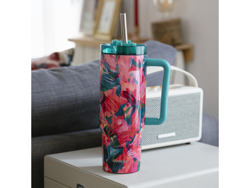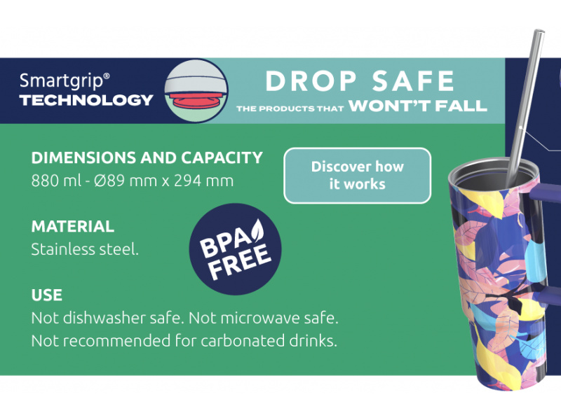 Termohrnek Quokka Vibe z vysoce kvalitní dvoustěnné oceli udrží teplotu nápoje studeného s ledem až 48 hodin, studeného až 14 hodin a teplého až 8 hodin. Termohrnek s vyjímatelným nerezovým brčkem umožňuje snadné pití bez nutnosti naklánění. Spolehlivý uzávěr z kvalitního Ecozen plastu chrání obsah před vylitím a umožňuje z termohrnku pít i bez brčka. Široké hrdlo umožňuje vložení kostek ledu a zároveň se díky němu hrnek snadno čistí. Quokka Vibe je součástí kolekce hrnků Drop Safe se speciálním dnem Smartgrip®, které při postavení na hladký povrch brání převržení a nechtěnému vylití obsahu hrnku. Tvar termohrnku je vhodný do většiny držáků nápojů v autě. Objem: 880 ml Rozměry: 294 x 89 mm Nerezový materiál neabsorbuje pachy a neobsahuje BPA. Termohrnek není vhodný do myčky ani mikrovlnné trouby.