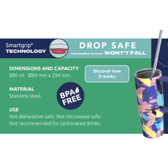 Termohrnek Quokka Vibe z vysoce kvalitní dvoustěnné oceli udrží teplotu nápoje studeného s ledem až 48 hodin, studeného až 14 hodin a teplého až 8 hodin. Termohrnek s vyjímatelným nerezovým brčkem umožňuje snadné pití bez nutnosti naklánění. Spolehlivý uzávěr z kvalitního Ecozen plastu chrání obsah před vylitím a umožňuje z termohrnku pít i bez brčka. Široké hrdlo umožňuje vložení kostek ledu a zároveň se díky němu hrnek snadno čistí. Quokka Vibe je součástí kolekce hrnků Drop Safe se speciálním dnem Smartgrip®, které při postavení na hladký povrch brání převržení a nechtěnému vylití obsahu hrnku. Tvar termohrnku je vhodný do většiny držáků nápojů v autě. Objem: 880 ml Rozměry: 294 x 89 mm Nerezový materiál neabsorbuje pachy a neobsahuje BPA. Termohrnek není vhodný do myčky ani mikrovlnné trouby.