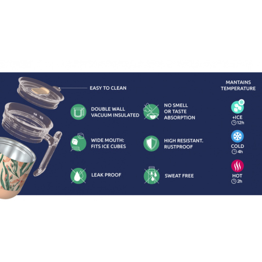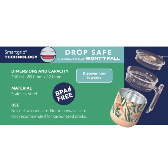 Termohrnek Quokka Wave z vysoce kvalitní dvoustěnné oceli se spolehlivým, 100% těsnicím uzávěrem udrží váš nápoj dle potřeby teplý či studený. Termohrnek udrží teplotu studeného nápoje s ledem až 12 hodin, studeného nápoje až 4 hodiny a teplého nápoje až 2 hodiny. Quokka Wave je součástí kolekce hrnků Drop Safe se speciálním dnem Smartgrip®, které při postavení na hladký povrch brání převržení a nechtěnému vylití obsahu hrnku. Široké hrdlo umožňuje vložení kostek ledu. Víčko se zaklapávacím uzávěrem umožňuje snadné pití přímo z hrnku. Objem: 260 ml Rozměry: 121 x 91 mm Nerezový materiál neabsorbuje pachy a neobsahuje BPA. Termohrnek není vhodný do myčky ani mikrovlnné trouby.