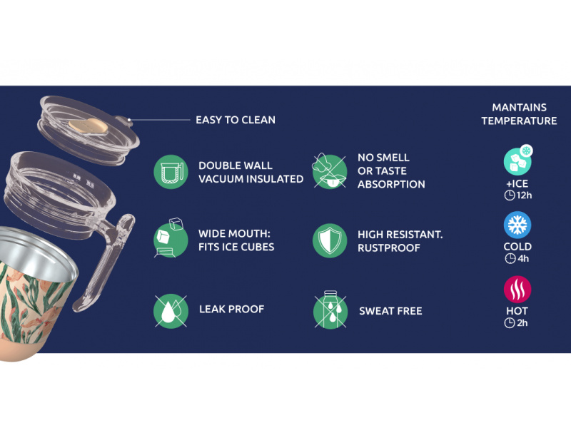 Termohrnek Quokka Wave z vysoce kvalitní dvoustěnné oceli se spolehlivým, 100% těsnicím uzávěrem udrží váš nápoj dle potřeby teplý či studený. Termohrnek udrží teplotu studeného nápoje s ledem až 12 hodin, studeného nápoje až 4 hodiny a teplého nápoje až 2 hodiny. Quokka Wave je součástí kolekce hrnků Drop Safe se speciálním dnem Smartgrip®, které při postavení na hladký povrch brání převržení a nechtěnému vylití obsahu hrnku. Široké hrdlo umožňuje vložení kostek ledu. Víčko se zaklapávacím uzávěrem umožňuje snadné pití přímo z hrnku. Objem: 260 ml Rozměry: 121 x 91 mm Nerezový materiál neabsorbuje pachy a neobsahuje BPA. Termohrnek není vhodný do myčky ani mikrovlnné trouby.