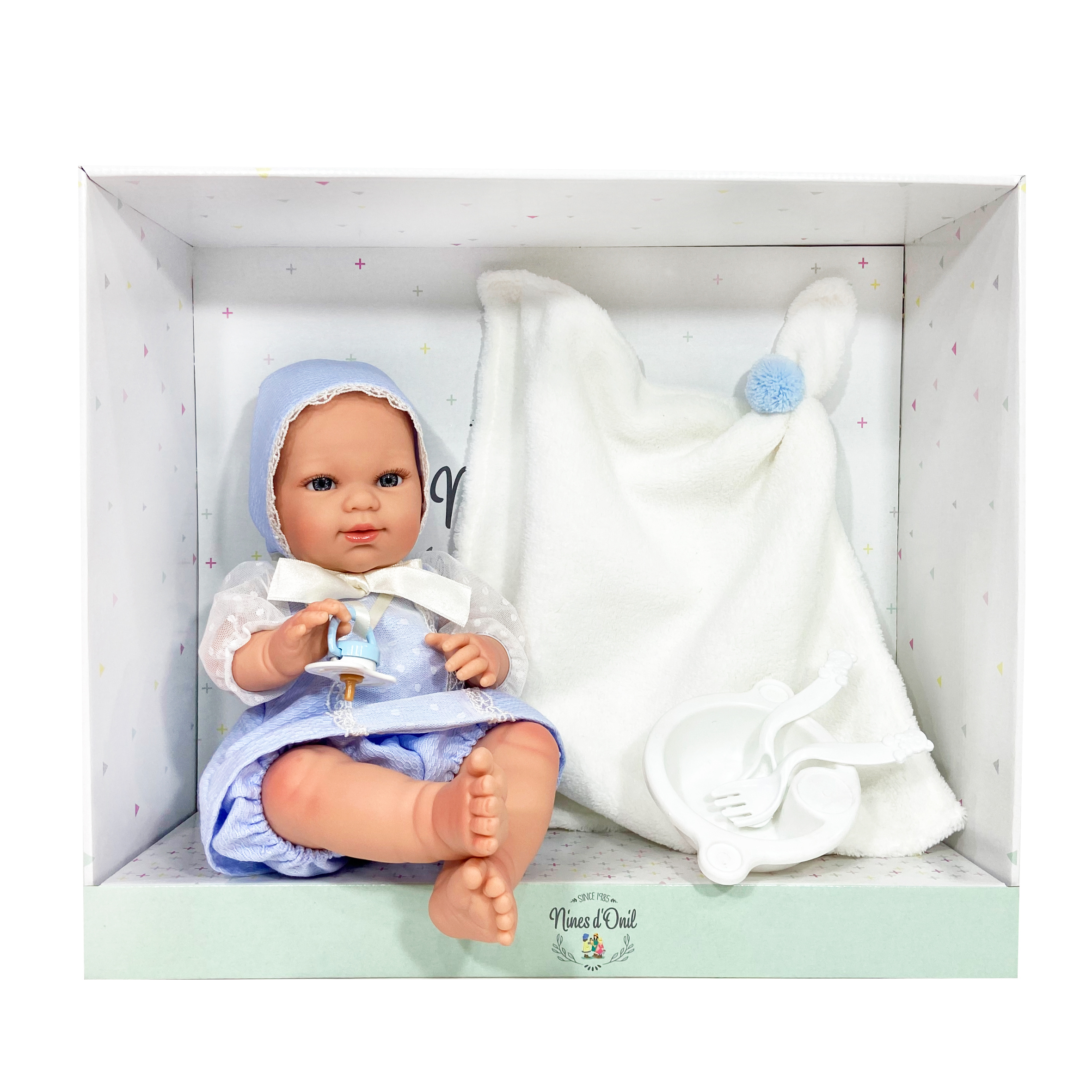 Na sobě má kalhotky, šatičky, čepičku. Součástí miminka, které je veliké 37 cm je talířek s příborem, dudlíček, měkkoučká dečka.