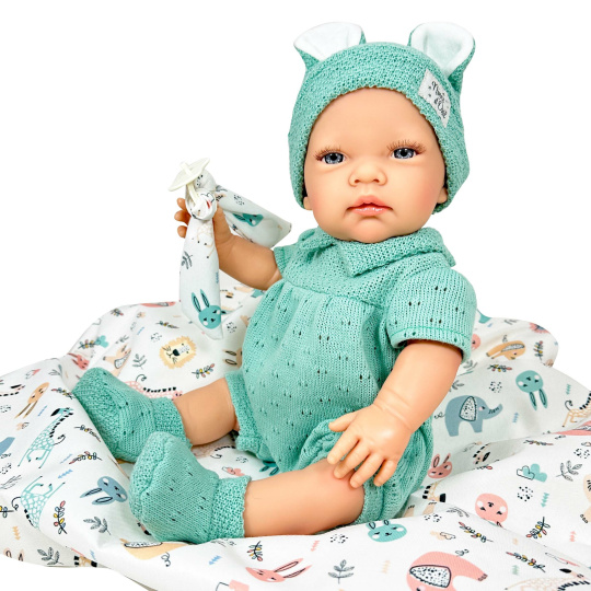| REBORN,miminko, chlapeček, které lze koupat. Ručně vyrobené realistické španělské miminko s celo vinylovým tělem. Miminko je vyrobené do nejjemnějších detailů s pohlavím Na sobě má pletený overal a pletenou čepičku. Na nohou má pletené capáčky. Součástí miminka, které je veliké 45 cm je dudlíček se spinkáčkem. Panenka jemně a trvale voní a je vyrobená ve Španělsku. Panenka je zabalená v látkovém vaku, který lze nosit jako batůžek. Panenka má certifikaci španělské vlády, že je vyrobená originál ve Španělsku. |