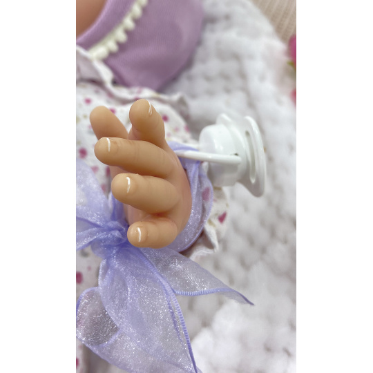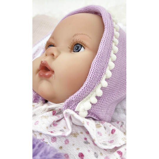 Na sobě má overal s límečkem, pletené capáčky a na hlavě má čepičku. Součástí miminka, které je veliké 48 cm je dudlíček , měkkoučká dečka a rodný list panenky.