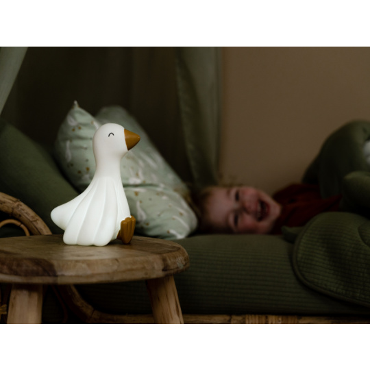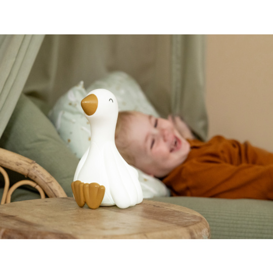 Noční lampička v podobě roztomilé husy je ideální pro klidné usínání vašeho dítěte. Lampička s jemným LED světlem funguje s bateriemi a je tak snadno přenosná. Její ovládání je velmi jednoduché, stačí ji jen zapnout. Pro úsporu baterií se světlo po 12 minutách automaticky vypne. Baterie 3x LR44 1,5 V jsou součástí. Rozměry: 18,5 x 14 x 10,5 cm