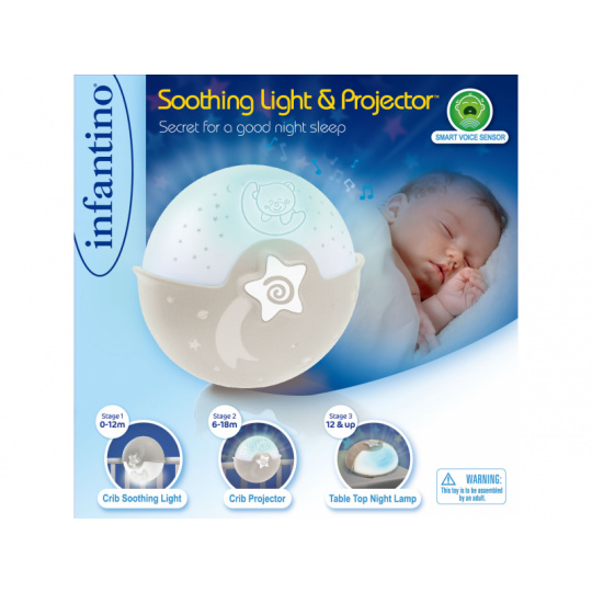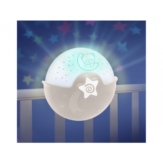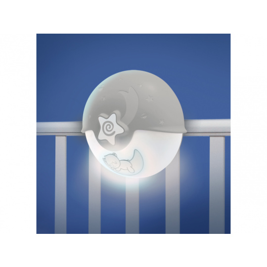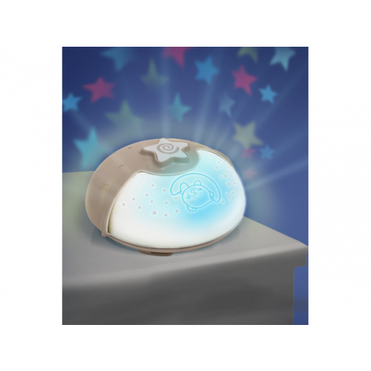 Noční lampička s hudbou a světelným projektorem pro klidné usínání vašeho dítěte. Lampička promítá na stěnu či strop hvězdičky a jemně tak osvítí dětský pokoj. Lampička nabízí 6 něžných melodií a 3 varianty zvuků přírody s automatickým vypnutím po 10 minutách. Pokud se dítě v noci probudí, senzor zvuku aktivuje uklidňující jemné světlo.  Lampička s projekcí může být připevněna na dětskou postýlku nebo postavena na noční stolek. Baterie 3xAA nejsou součástí. Vhodné pro děti od narození.