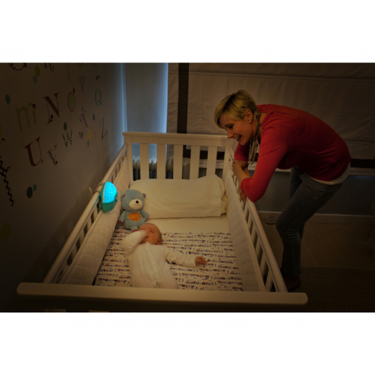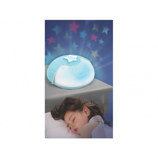 Noční lampička s hudbou a světelným projektorem pro klidné usínání vašeho dítěte. Lampička promítá na stěnu či strop hvězdičky a jemně tak osvítí dětský pokoj. Lampička nabízí 6 něžných melodií a 3 varianty zvuků přírody s automatickým vypnutím po 10 minutách. Pokud se dítě v noci probudí, senzor zvuku aktivuje uklidňující jemné světlo.  Lampička s projekcí může být připevněna na dětskou postýlku nebo postavena na noční stolek. Baterie 3xAA nejsou součástí. Vhodné pro děti od narození.
