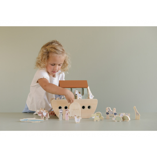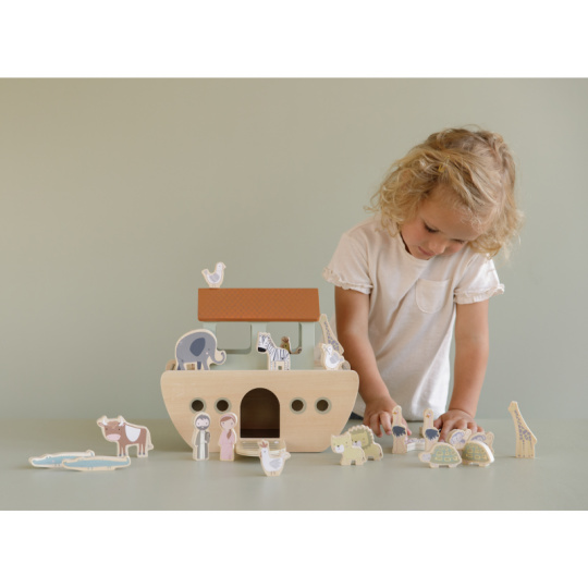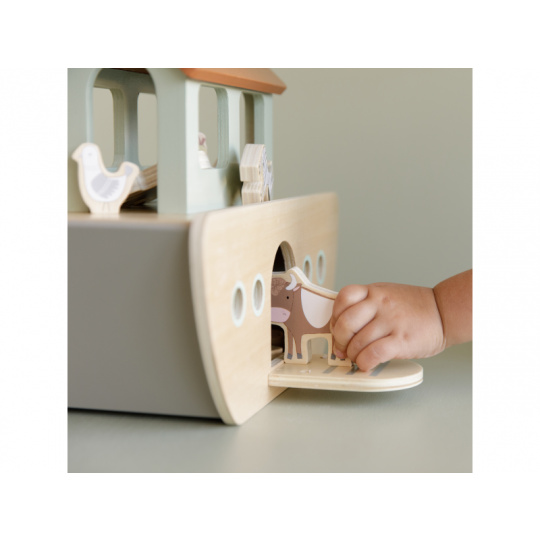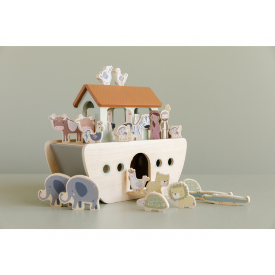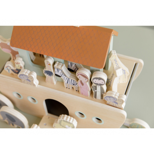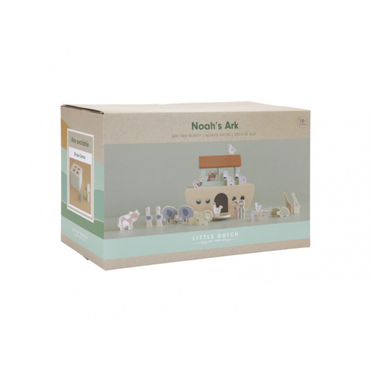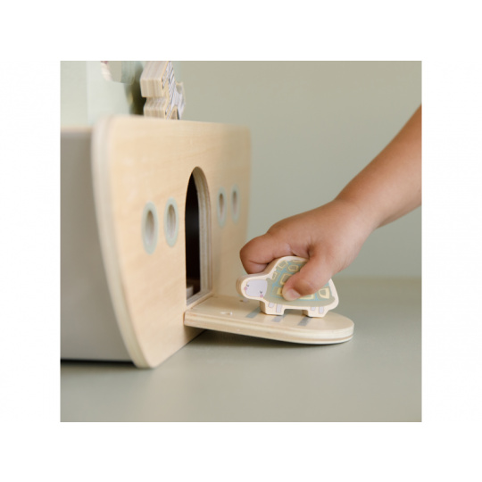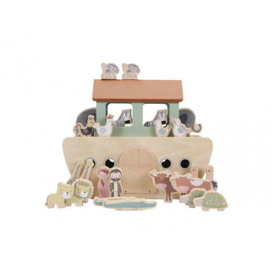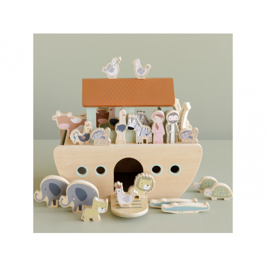 Všichni na palubu! Zahrajte si příběh Noemovy archy s touto krásnou dřevěnou sadou. Najděte páry zvířat, která k sobě patří a připravte je na cestu. 25-dílná dřevěná sada obsahuje archu s dveřmi, palubu, kterou lze zvednout a přivést všechna zvířata na palubu. Noe vezme svoji ženu a velkou skupinu zvířat na cestu přes oceán: 2 lvy, 2 slony, 2 zebry, 2 opice, 2 holuby, 2 krokodýly, 2 želvy, 2 žirafy, 2 pštrosy, 2 krávy, slepici a kohouta. Hračka pomáhá rozvíjet představivost a slovní zásobu, zatímco vaše dítě poznává tento klasický příběh. Rozměry: 29,7 x 24,7 x 14,6 cm Vhodné pro děti od 18 měsíců.