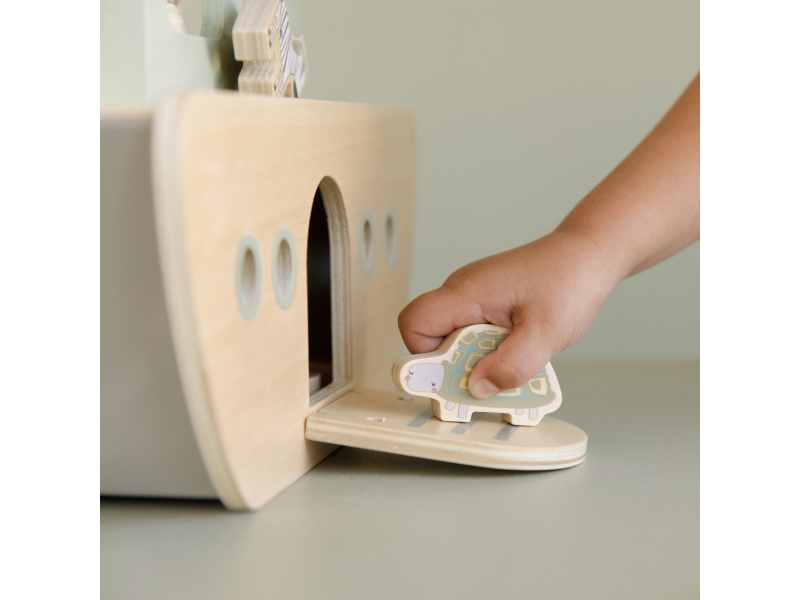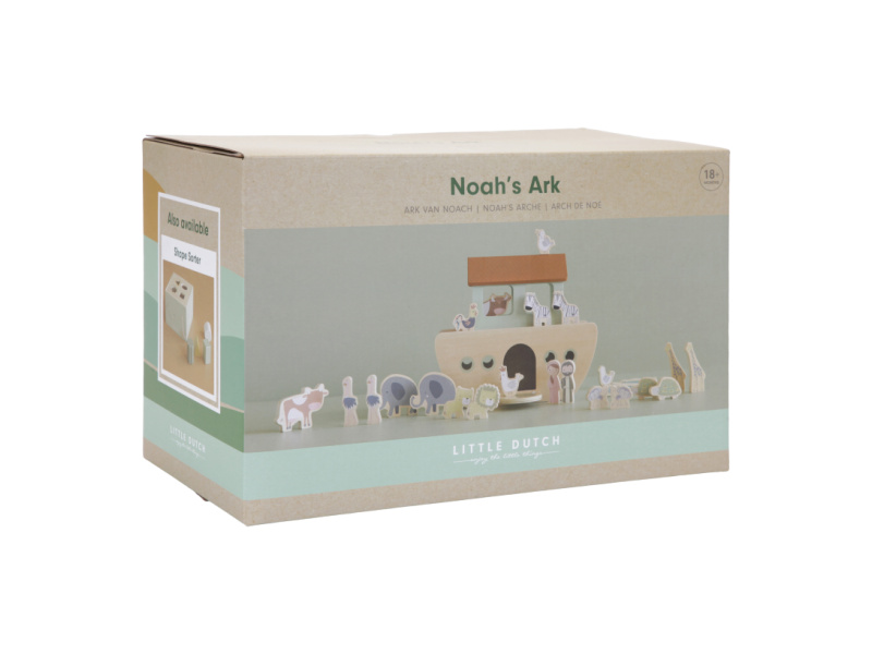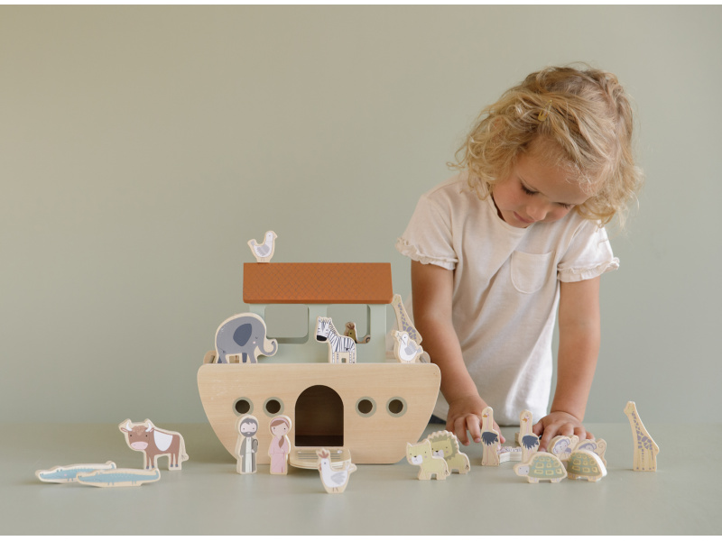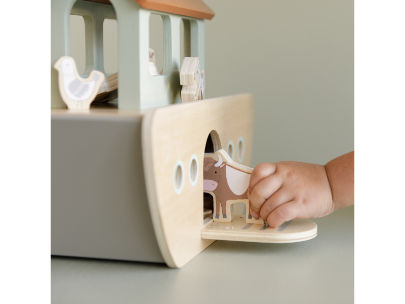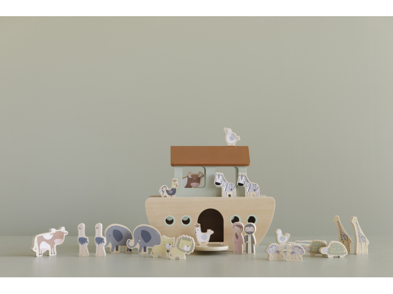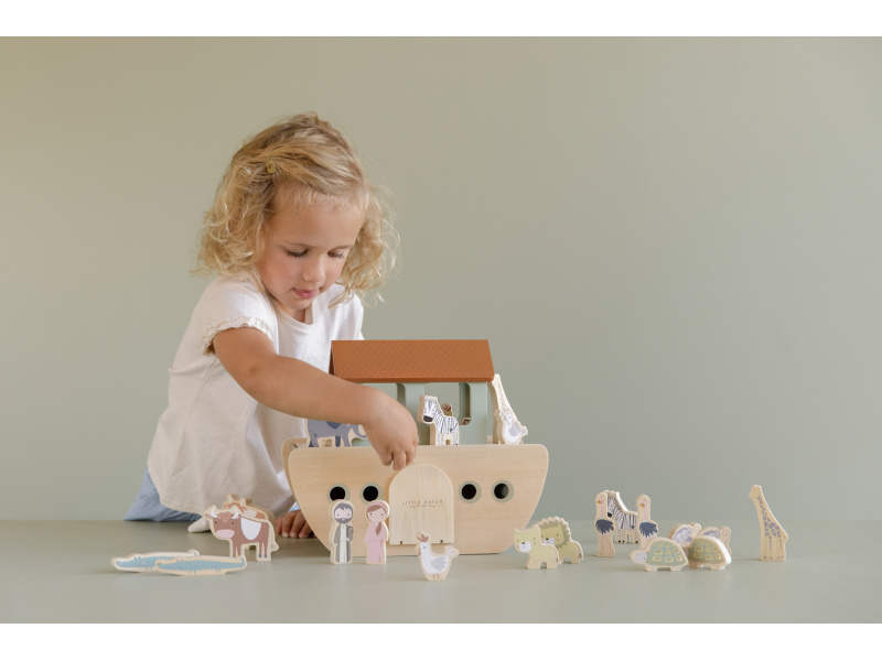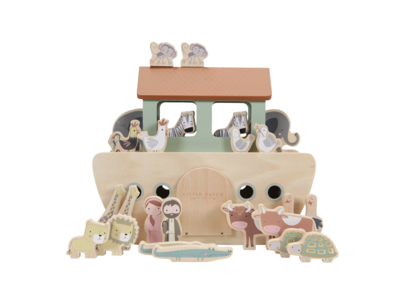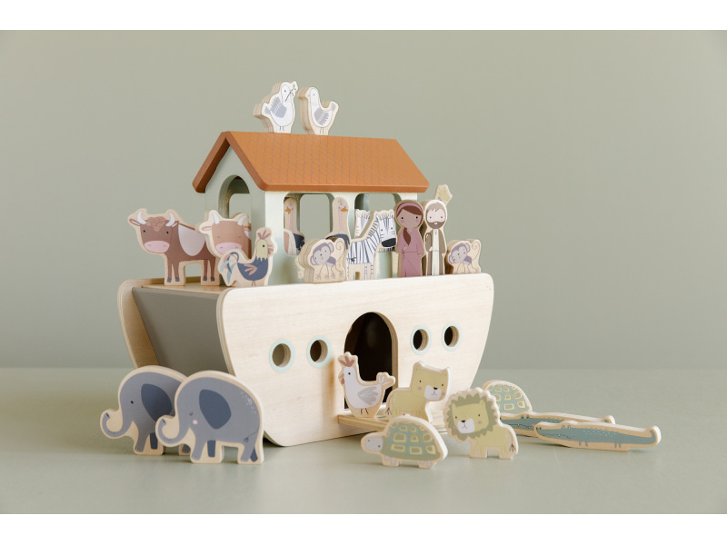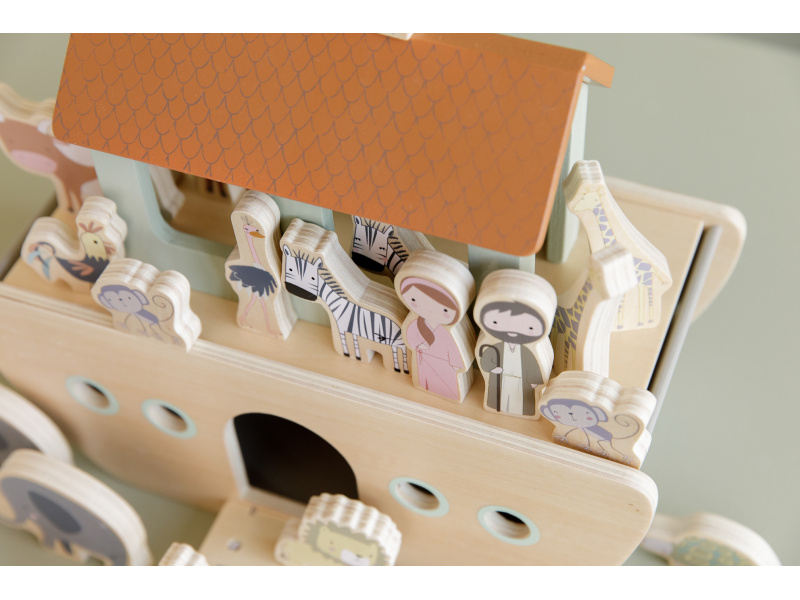 Všichni na palubu! Zahrajte si příběh Noemovy archy s touto krásnou dřevěnou sadou. Najděte páry zvířat, která k sobě patří a připravte je na cestu. 25-dílná dřevěná sada obsahuje archu s dveřmi, palubu, kterou lze zvednout a přivést všechna zvířata na palubu. Noe vezme svoji ženu a velkou skupinu zvířat na cestu přes oceán: 2 lvy, 2 slony, 2 zebry, 2 opice, 2 holuby, 2 krokodýly, 2 želvy, 2 žirafy, 2 pštrosy, 2 krávy, slepici a kohouta. Hračka pomáhá rozvíjet představivost a slovní zásobu, zatímco vaše dítě poznává tento klasický příběh. Rozměry: 29,7 x 24,7 x 14,6 cm Vhodné pro děti od 18 měsíců.