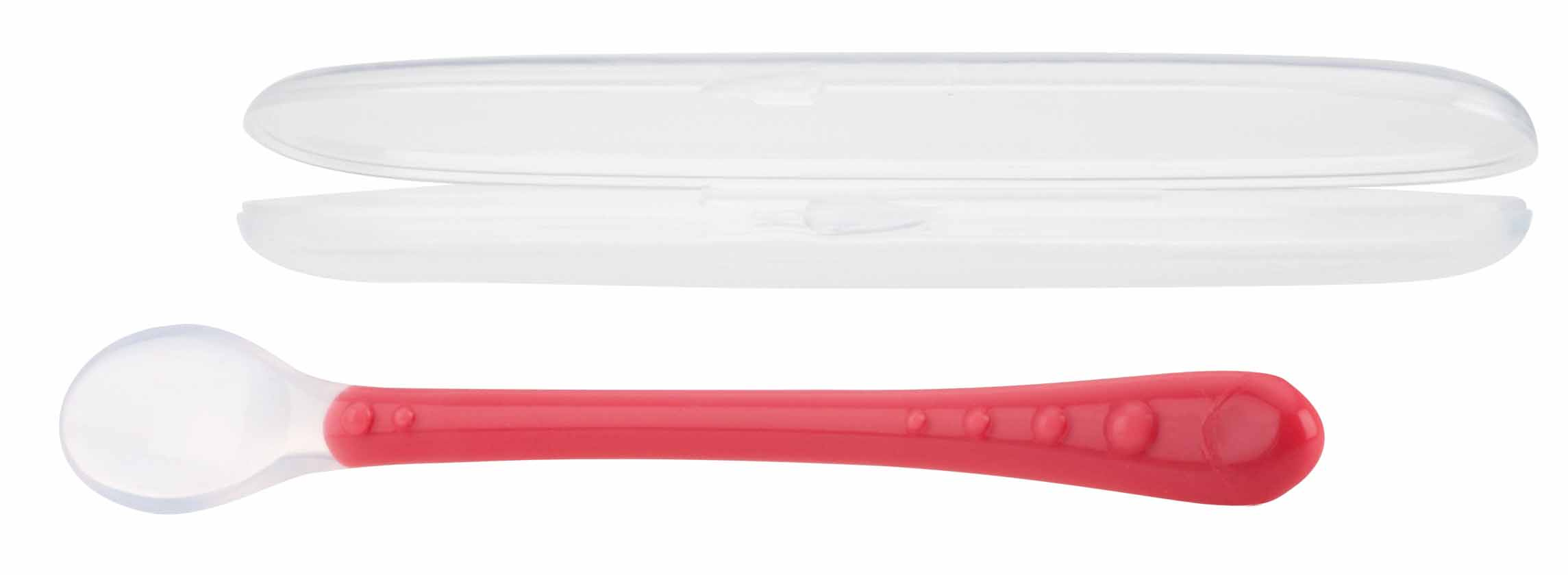NUBY Lžička silikon s dlouhou rukojetí a s obalem 1 ks, 6 m+, červená