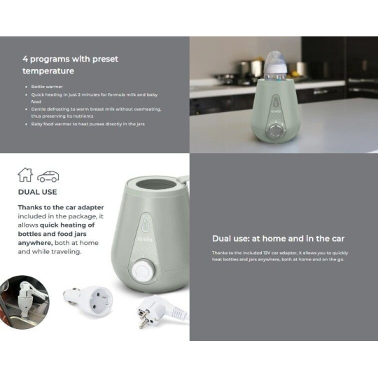 Nuvita domácí a automobilový ohřívač lahví je ideálním řešením pro rodiče, kteří chtějí rychle a bezpečně připravit mléko nebo jídlo pro své dítě, a to i během cestování. Díky kompaktnímu designu a širokému otvoru (8,5 cm) je vhodný pro všechny typy lahví a skleniček, bez ohledu na velikost nebo materiál (plast i sklo).