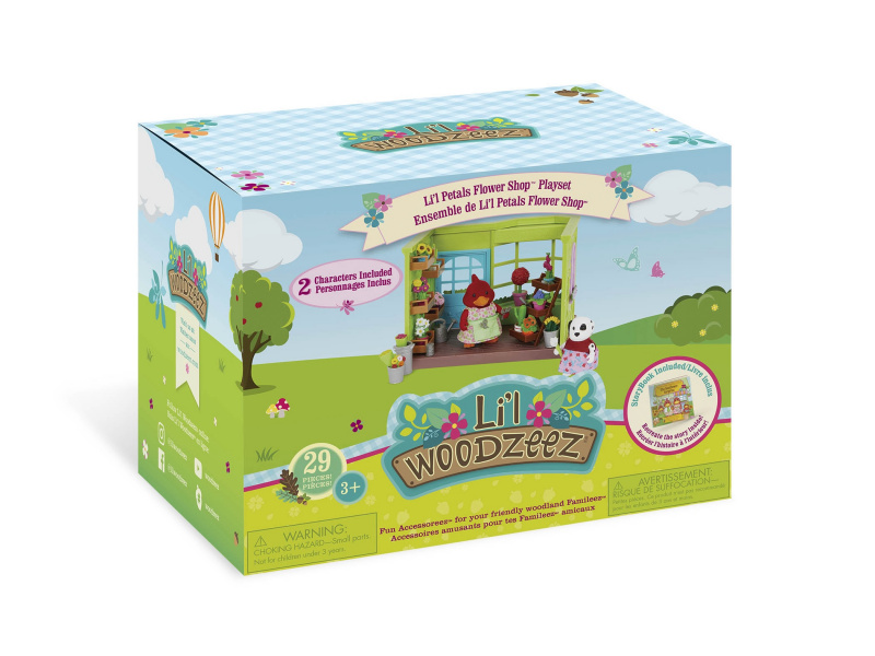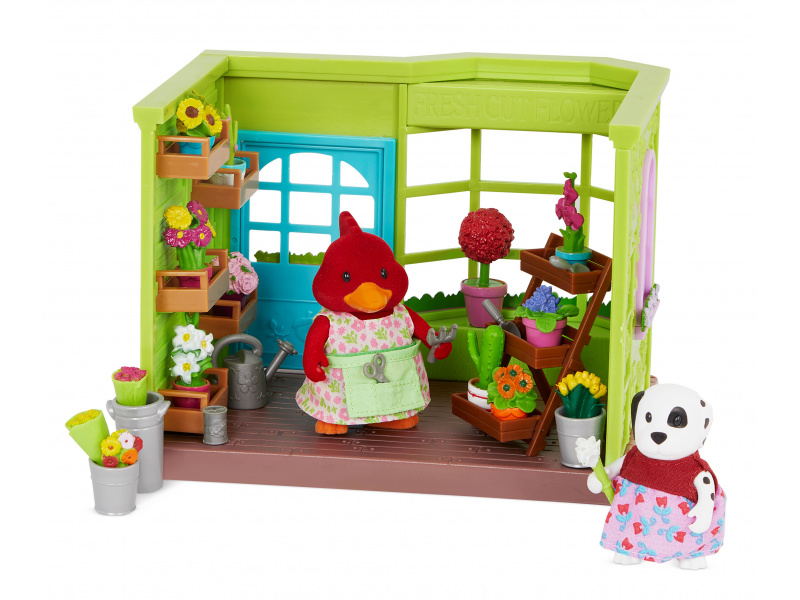 Obchod s květinami je oblíbeným místem, kde se obyvatelé městečka Honeysuckle Hollow zastaví na svých procházkách městem. Ať už obdivují květinová aranžmá v obchodě nebo si kupují domů kytici, květinářky Annie a Ruby je vždy přivítají a obslouží s úsměvem! 29-dílná sada obsahuje květinářství, stojan na květiny, 2 malé kbelíky, plechovku, vysoký kbelík, 3 kytice řezaných květin, 2 kytice růží, 4 malé hrnkové rostliny, 3 větší hrnkové rostliny, květinový strom, 2 kaktusy, konev, hrabičky, 2 lopatky, nůžky, 2 postavičky zvířátek (kardinál Annie a dalmatin Ruby) a pohádkovou knížku v angličtině. Postavičky zvířátek Li'l Woodzeez jsou vyrobené z měkkého příjemného materiálu a mají pohyblivé ruce, nohy i hlavy pro zábavnou předstíranou hru. Každá postavička má na sobě krásné barevné oblečení. Další postavičky zvířátek, domečky, obchody, dopravní prostředky apod. se prodávají samostatně. Všechny postavičky a doplňky Li'l Woodzeez jsou navzájem kompatabilní a umožní vám vytvořit originální městečko pro nekonečnou hru rozvíjející fantazii a kreativitu vašeho dítěte. Vhodné pro děti od 3 let.