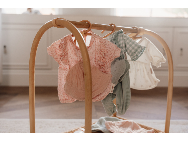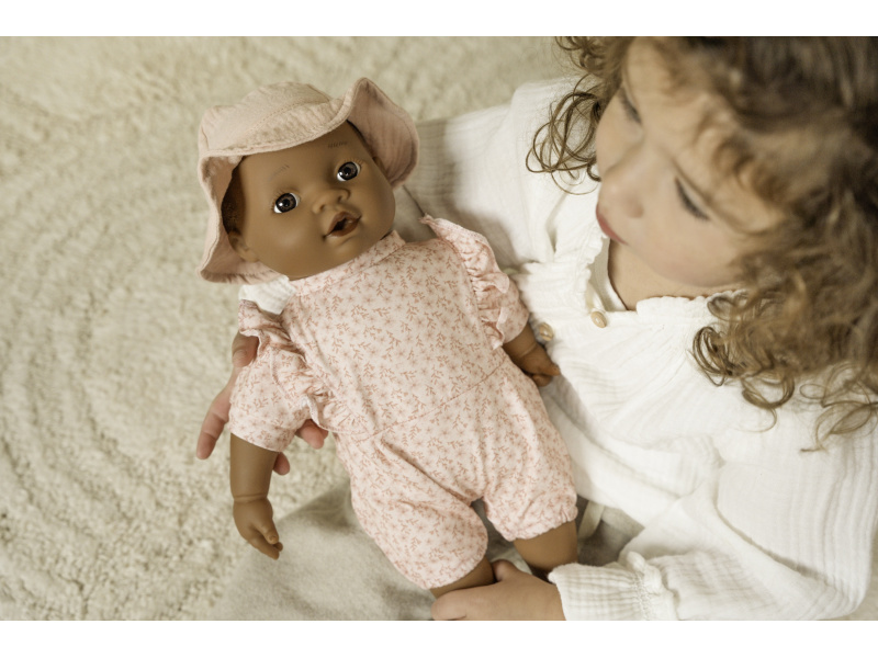 Krásná sada oblečení s něžným květinovým potiskem pro panenku Little Dutch Baby obsahuje overal s krátkými nohavicemi a klobouček. Vhodné pro děti od 18 měsíců.