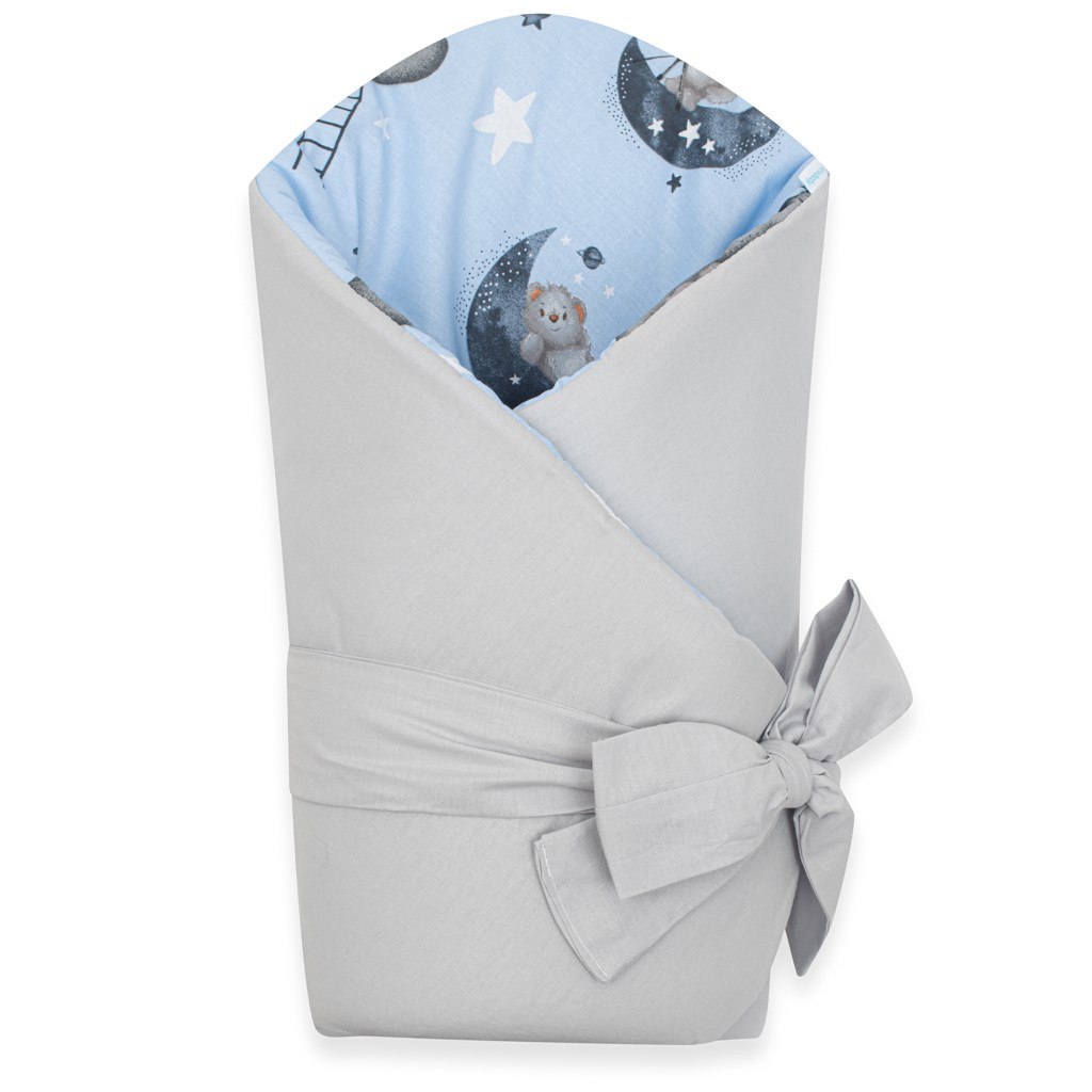 Nádherná dětská oboustranná zavinovačka české značky New Baby Teddy bear in space pro miminka. Zavinovačka je vyrobena z kvalitního a jemného materiálu, který zaručí vašemu miminku příjemné teplo. Výplň je až 3 cm co znamená, že zavinovačka je vhodná i na chladnější dny a je dostatečně pevná. Krásný dětský motiv, polahodí dětským očičkám. Zapínání na suchý zip i pásek na zavázaní na mašli.