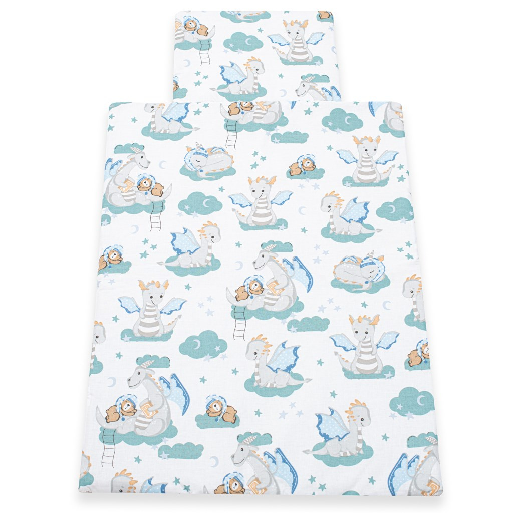 Nádherný oboustranný set New Baby Dráček do kočárku. Set je vyroben ze dvou typů tkanin. Bavlněný materiál s krásným dětským motivem z jedné strany a Velvet materiál z druhé strany. Velvet je velice příjemný a jemný na dotek a po dlouhou dobu si zachovává svůj původní tvar. Je ideální jak pro miminka od narození, tak pro větší děti jako deka na hraní, do kočárku nebo na ven. Set obsahuje polštářek a přikrývku. Klademe důraz na kvalitu a proto je set z Velvet ušitý z velmi kvalitního materiálu, který nepouští barvu a nevyvolává alergické reakce. Set je jemný na dotek, hřejivý, tulivý, jedinečný a velmi odlišný od ostatních. Vše je vyplněno antialergickým vláknem. Složení: z jedné strany 100% bavlna potištěná krásným dětským vzorem, druhá strana je Velvet látka-100% polyester, výplň 100% antialergické vlákno. Materiál odpovídá normě Oeko-Tex Standard 100. Rozměry: polštářek: cca 30x25 cm, přikrývka: cca 75x50 cm. Tyto výrobky jsou bezpečné, protože: