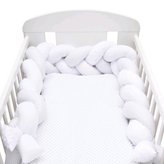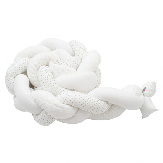 Heboučký a praktický pletený cop české značky New Baby je moderní alternativou tradičního nebo polštářového mantinelu nejen do dětské postýlky. Všechny tři prameny jsou vyrobeny z velmi kvalitního bavlněného materiálu, minky a antialergické polyesterové výplně a ručně spletené do copu. Můžete jej použít v postýlce, kolébce, kde chrání dítě před tvrdými příčkami postýlky a izoluje od studené stěny. Mantinel se přizpůsobí každé postýlce a pomocí tří přiložených stuh jej snadno upevníte. Starší dítě jej může využívat pro zábavu nebo jako originální dekoraci dětského pokoje.