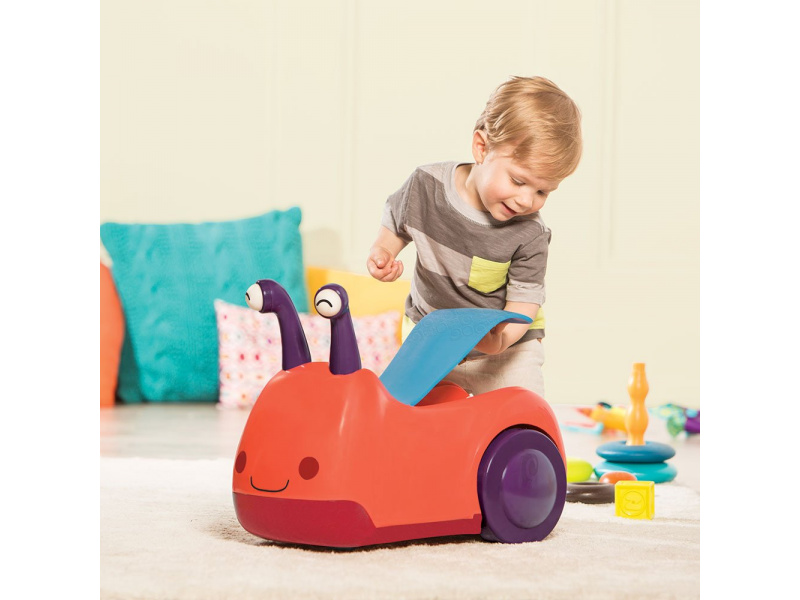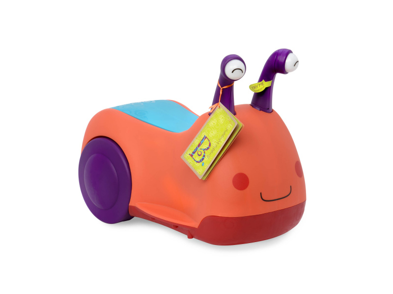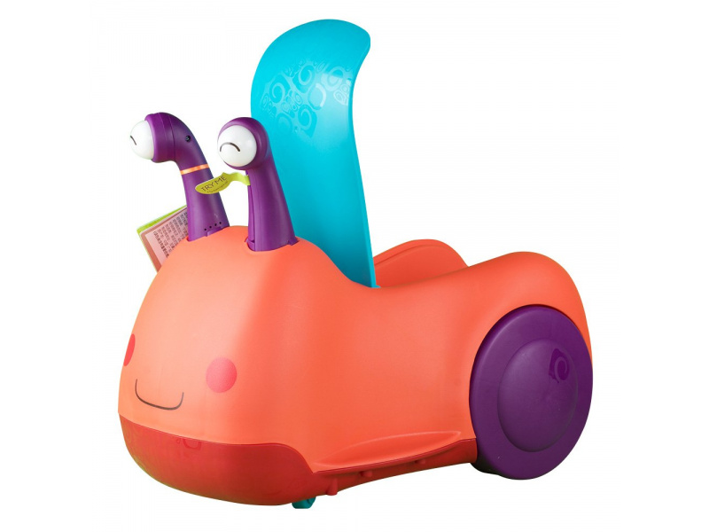 Odrážedlo v podobě usměvavého šneka vůbec není pomalé jako šnek! Otočná přední kolečka usnadňují manévrování, úložný prostor pod sedadlem se hodí na uložení oblíbené hračky nebo svačinky. Pro větší zábavu během jízdy oči šnečka po zmáčknutí svítí a vydávají zvuky. Baterie 3xAAA jsou součástí. Plyšová hračka není součástí výrobku. Rozměry: 50 x 27 x 38 cm Vhodné pro děti od 1 do 3 let.