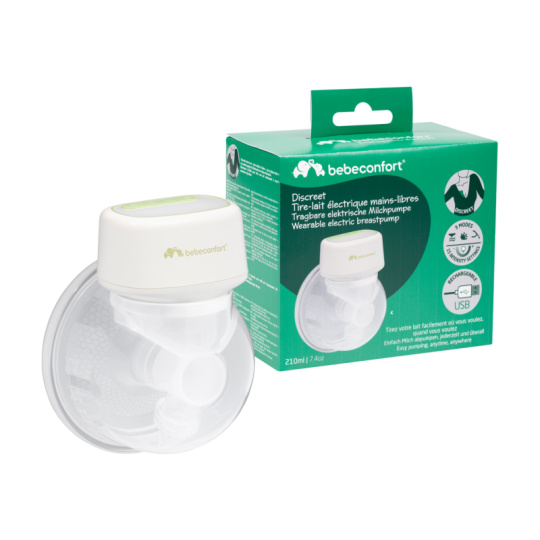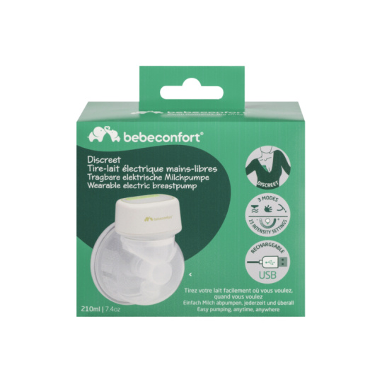 Elektrická nositelná odsávačka mateřského mléka Bebeconfort Discreet vám umožní pokračovat v kojení, aniž byste musela přerušit každodenní aktivity. Ať už se vracíte do práce, staráte se o domácnost nebo jste na cestách, tato odsávačka nabízí pohodlí a diskrétnost – snadno se schová pod oblečení a nijak nepřekáží. Dobíjecí provedení pro pohodlné bezdrátové používání Paměť posledního nastavení pro další odsávání Velká nádoba (210 ml) umožňuje odsátí obou prsou bez nutnosti častého vyprazdňování Tichý provoz (51 dB) zajišťuje diskrétní použití kdekoliv 3 režimy odsávání: Masážní – jemné a rychlé sání pro přípravu Stimulační – napodobuje sání dítěte a podporuje tvorbu mléka Odsávací – intenzivnější sání pro efektivní sběr mléka 15 úrovní intenzity pro přizpůsobení vašim potřebám Dobíjecí baterie pro cca 5 hodin použití Snadná údržba Obsah balení: 4 silikonové nástavce na bradavky různých velikostí (16–18–20–22 mm) Náhradní silikonový ventil Nabíjecí kabel USB-C (adaptér není součástí balení) Ochranné víčko Pásek na upevnění ke spodnímu prádlu Transportní taštička