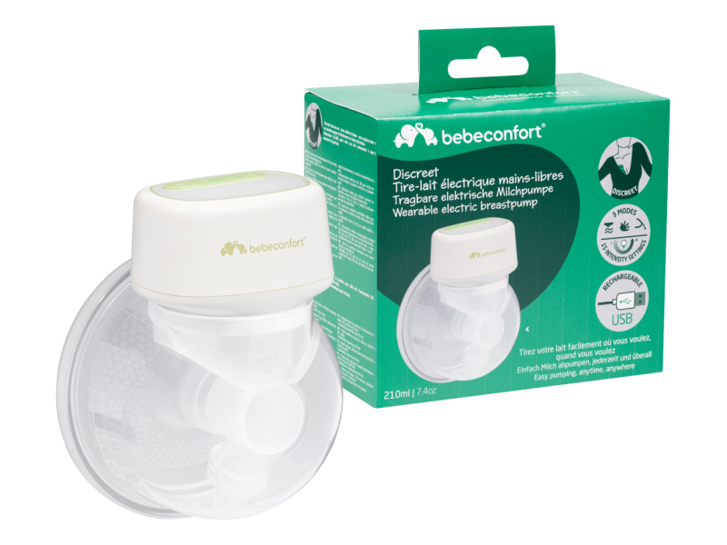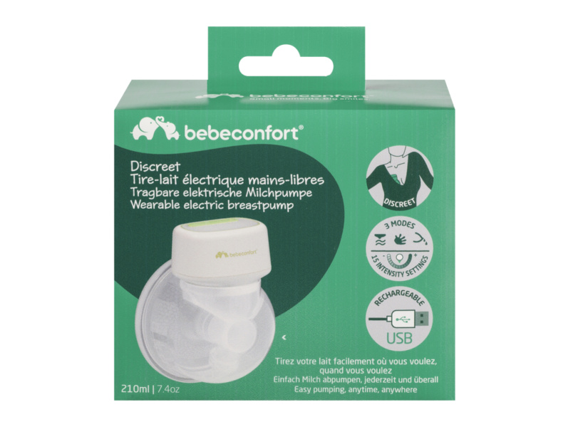 Elektrická nositelná odsávačka mateřského mléka Bebeconfort Discreet vám umožní pokračovat v kojení, aniž byste musela přerušit každodenní aktivity. Ať už se vracíte do práce, staráte se o domácnost nebo jste na cestách, tato odsávačka nabízí pohodlí a diskrétnost – snadno se schová pod oblečení a nijak nepřekáží. Dobíjecí provedení pro pohodlné bezdrátové používání Paměť posledního nastavení pro další odsávání Velká nádoba (210 ml) umožňuje odsátí obou prsou bez nutnosti častého vyprazdňování Tichý provoz (51 dB) zajišťuje diskrétní použití kdekoliv 3 režimy odsávání: Masážní – jemné a rychlé sání pro přípravu Stimulační – napodobuje sání dítěte a podporuje tvorbu mléka Odsávací – intenzivnější sání pro efektivní sběr mléka 15 úrovní intenzity pro přizpůsobení vašim potřebám Dobíjecí baterie pro cca 5 hodin použití Snadná údržba Obsah balení: 4 silikonové nástavce na bradavky různých velikostí (16–18–20–22 mm) Náhradní silikonový ventil Nabíjecí kabel USB-C (adaptér není součástí balení) Ochranné víčko Pásek na upevnění ke spodnímu prádlu Transportní taštička