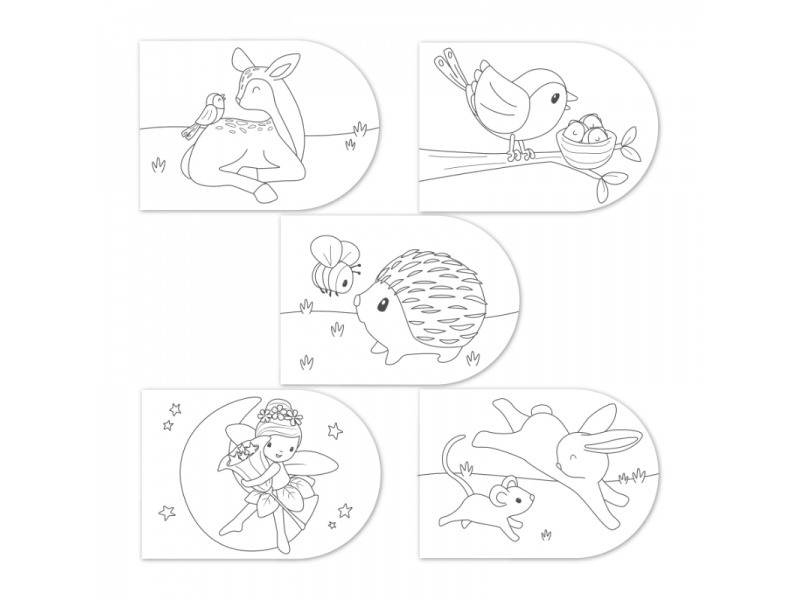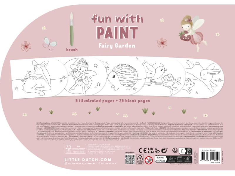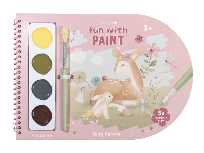 Krásné omalovánky na silném papíru obsahují 4 akrylové barvy se štětcem, 5 jednoduchých obrázků s motivy zvířátek a 25 čistých stránek pro malování dle vlastní fantazie dítěte. Díky spirále ve hřbetu se stránky omalovánek snadno otáčí. Omalovánky nabízí skvělý způsob, jak rozvíjet jemnou motoriku i představivost dítěte. Omalovánky jsou součástí designové kolekce hraček a doplňků Little Dutch Fairy Garden, inspirované životem na zahradě. Rozměry: 21 x 30 x 1,5 cm Vhodné pro děti od 3 let.