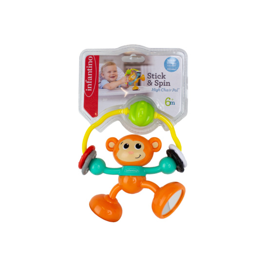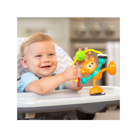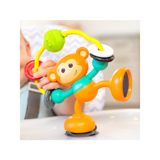 Hračku v podobě rošťácké opičky s přísavkou na jedné noze lze postavit na pult vysoké židličky, stůl apod. Při otáčení opičky se ozývá cvakání, pohyblivé kroužky a zrcátko na spodní straně druhé nohy lákají ke zkoumání. Hračka rozvíjí jemnou motoriku dítěte a učí jej vztahu příčina / následek. Vhodné pro děti od 6 měsíců.